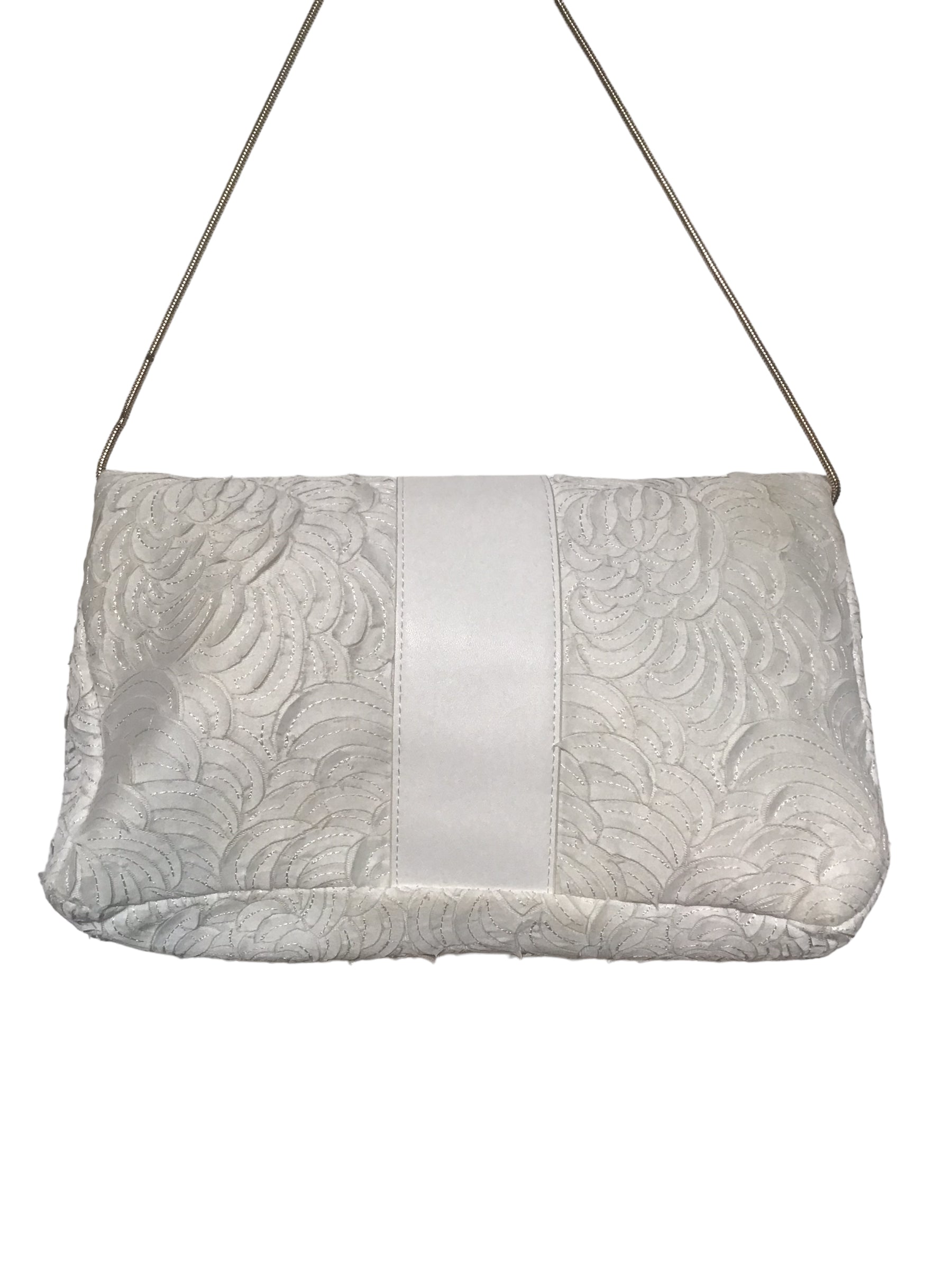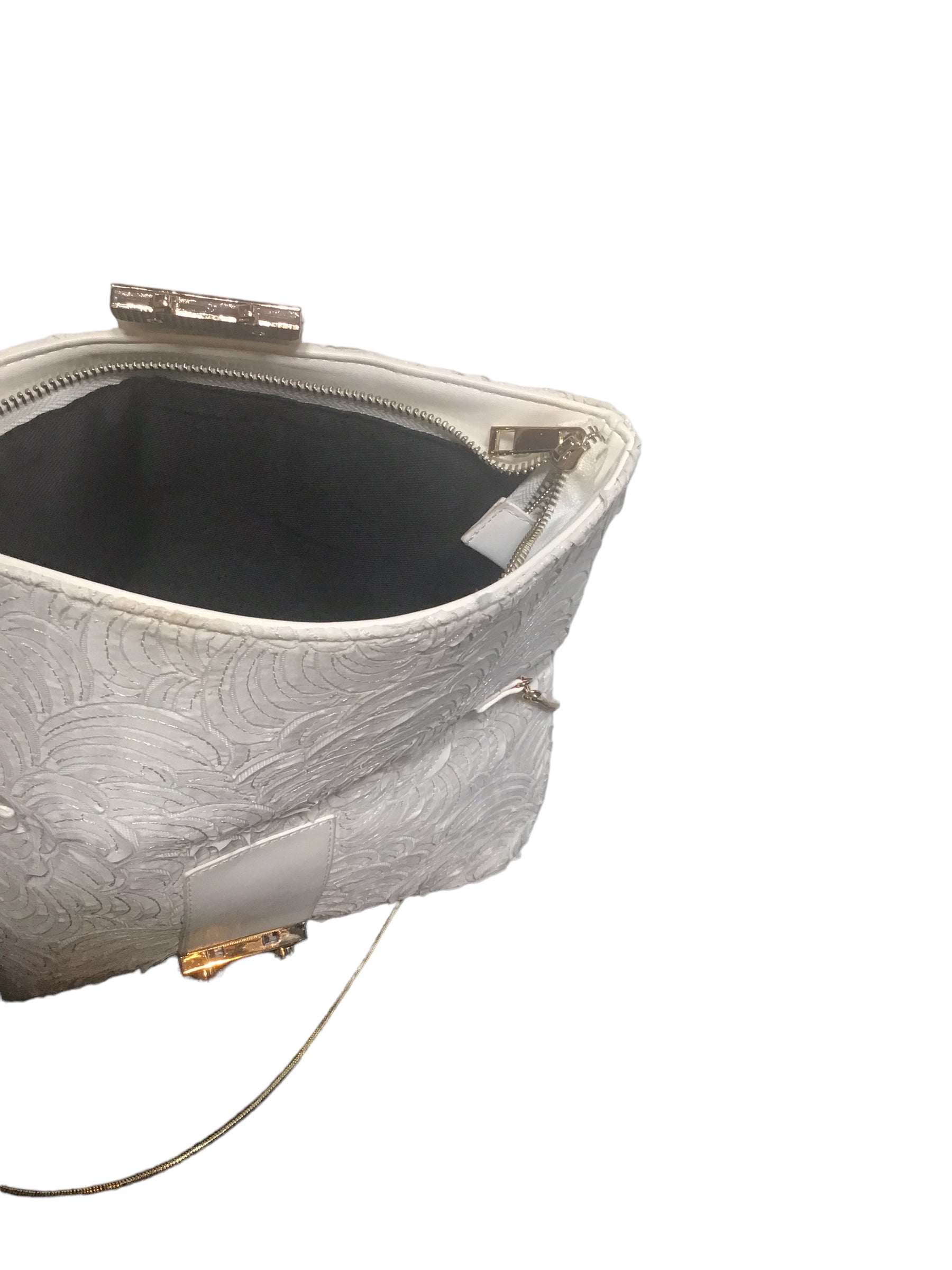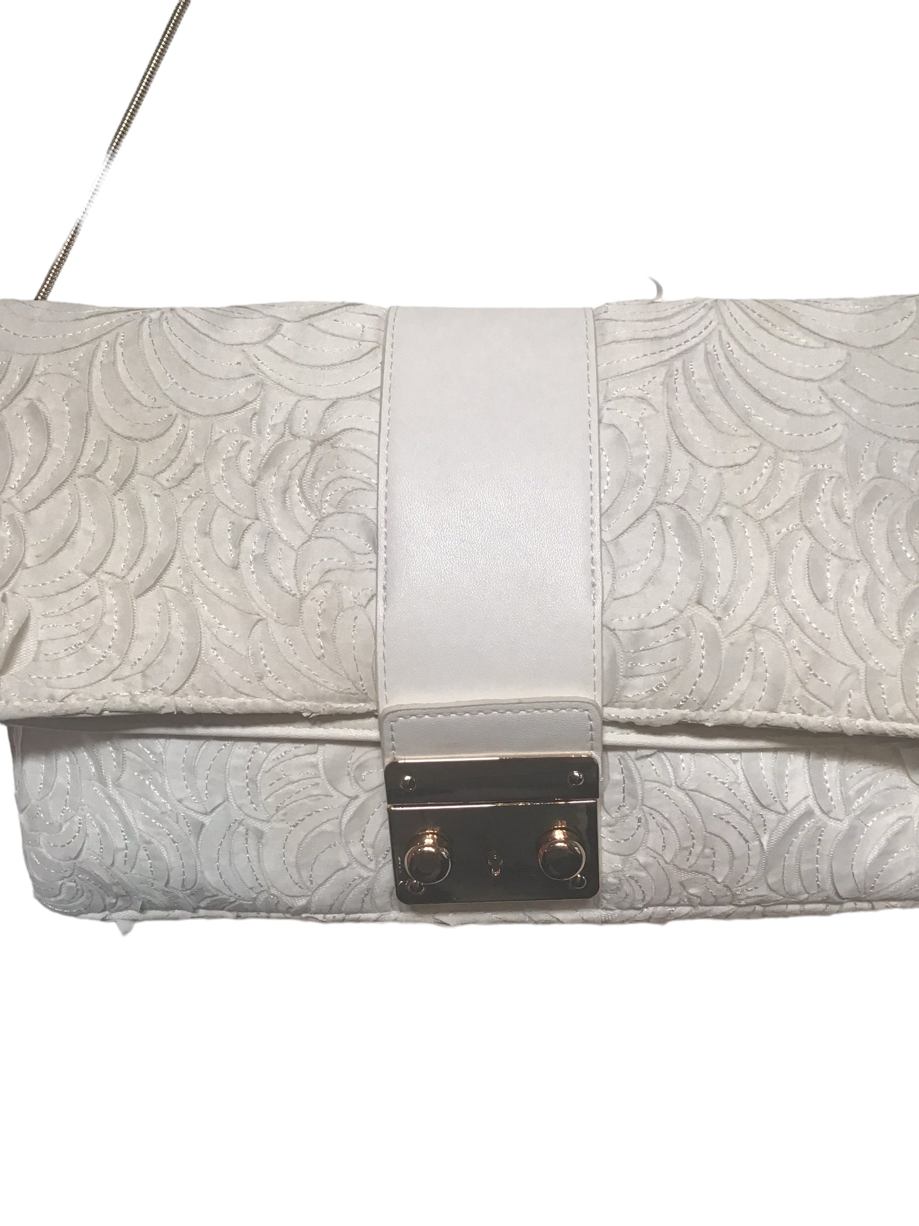 White lace detail bag with a gold buckle and a gold dainty strap