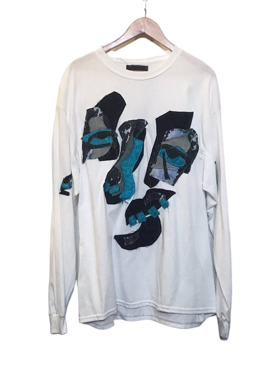 White long sleeved top with blue graphics in the centre and on the sleeves